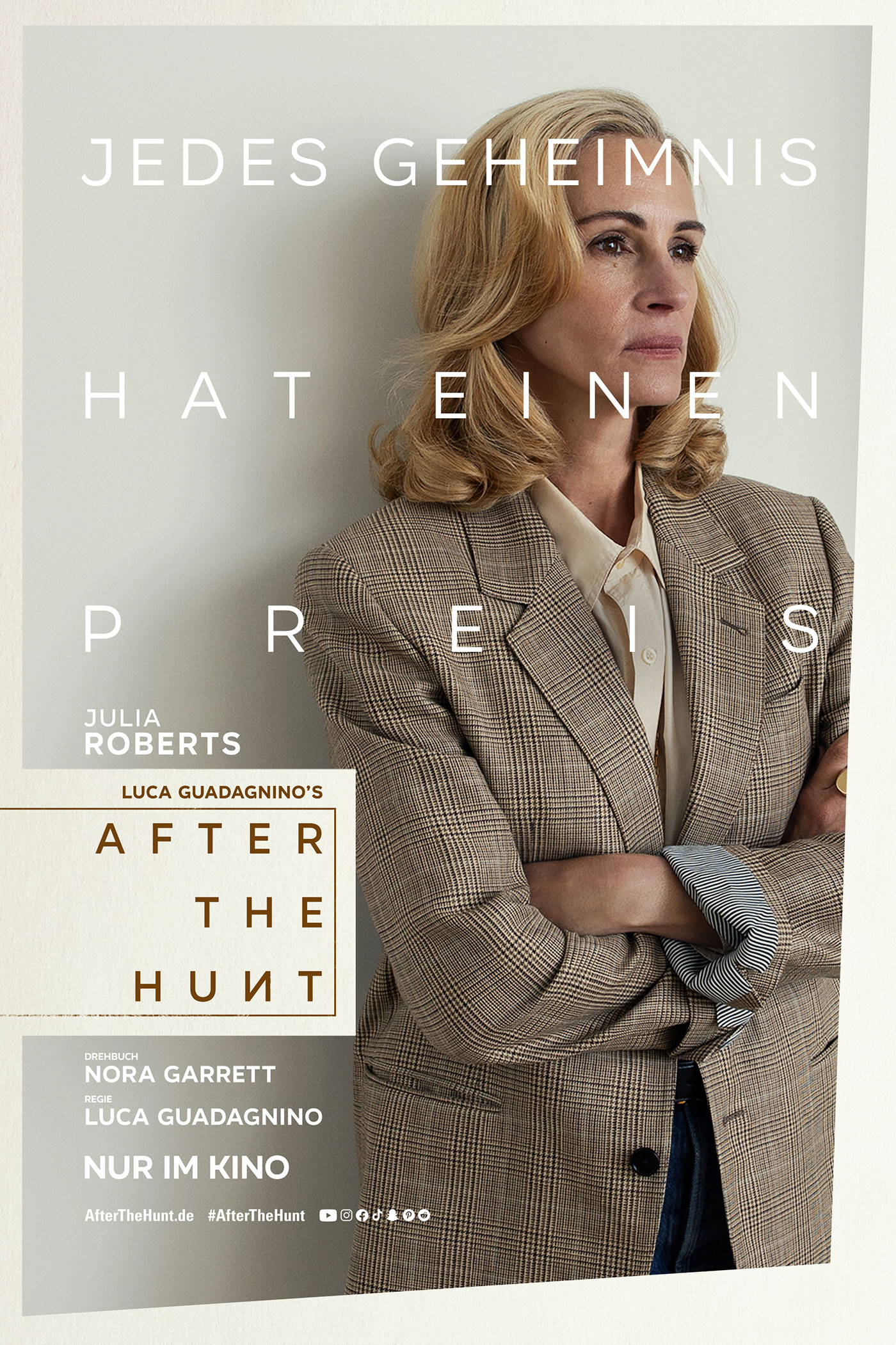 In den Hauptrollen in AFTER THE HUNT sind zu sehen Ayo Edebiri, Andrew Garfield, Julia Roberts, Chloë Sevigny und Michael Stuhlbarg. Brian Grazer, p.g.a., Luca Guadagnino, Jeb Brody, p.g.a., Allan Mandelbaum, p.g.a. produzierten den Film nach einem Drehbuch von Nora Garrett. Executive Producers sind Karen Lunder, Justin Wilkes, Alice Dawson und Nora Garrett. Die Musik wurde geschrieben von Trent Reznor & Atticus Ross. Ein Film von Luca Guadagnino.